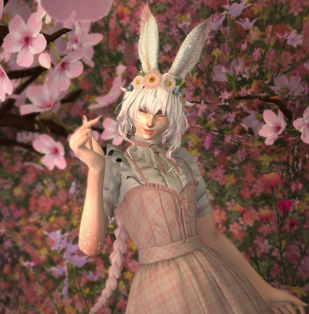 Cherén is an excessively sweet and gentle Viera.He cherishes kindness above all else and will do his best at all times to help others and bring happiness to them. This silly bunny has a penchant for friendly mischief-making, and is sure to bring a smile to your face with his antics.He is a very skilled healer both magically and practically. Cherén can heal a wound using his skills as a scholar, or give you stitches and make medicine by hand. His magical talents focus on healing, the soul, and spirits.Hand in hand with his medicine making, Cherén loves gardening and planting. He makes specialized medicine with a rare plant raised by his tribe called "Chasia."Cherén has an affinity for seeing and speaking with both spirits and fae and enjoys their company greatly. Although he values their friendship, he's quick to warn others against their tricky nature.Speaking of tricky spirits, Cherén has a familiar named Chichan who takes the form of a white bunny, and is seen accompanying him at almost every waking moment. The bunny has been known to get into his own sort of trouble, but also to perform oddly powerful magic and heal others.His favorite things are sweets, animals, pink, bunnies, fae, and spirits.